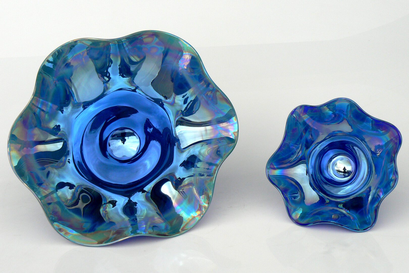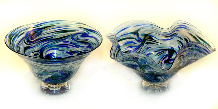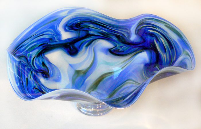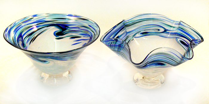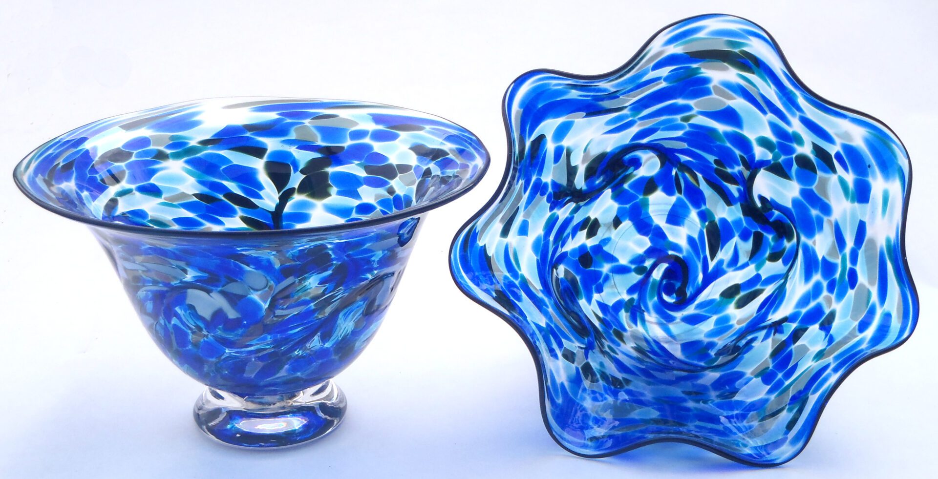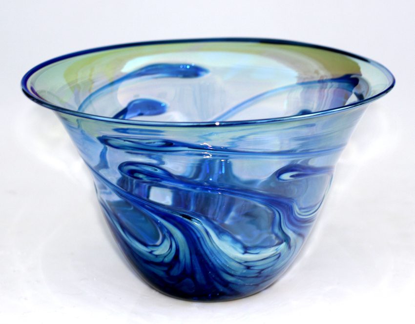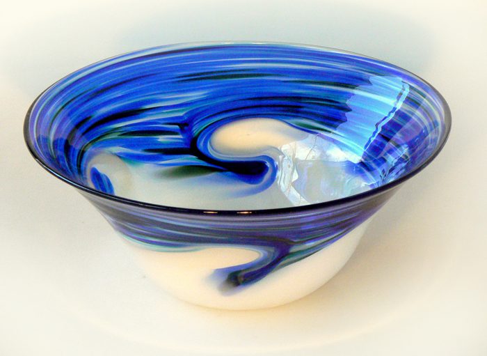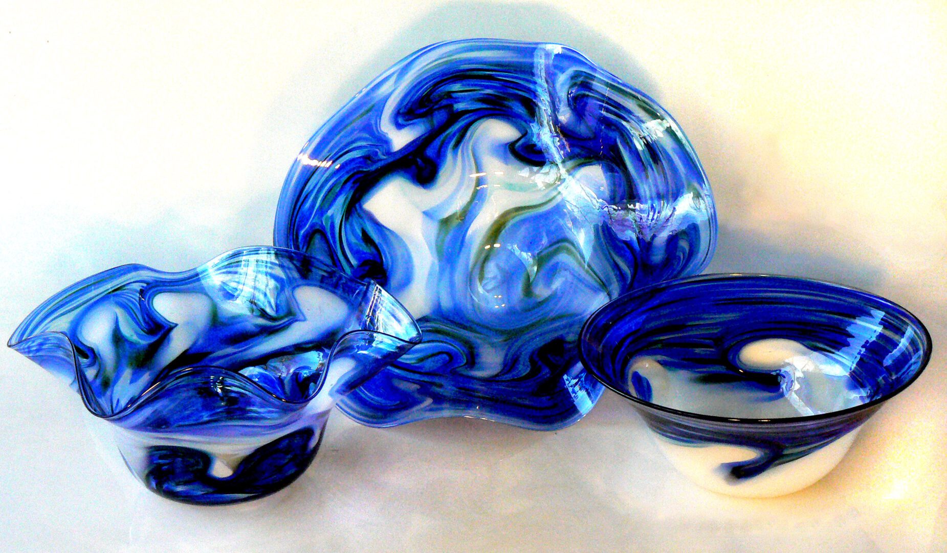 A blue glass bowl sitting on top of a table. A blue and white glass bowl sitting on top of a table. A blue glass bowl sitting on top of a table.