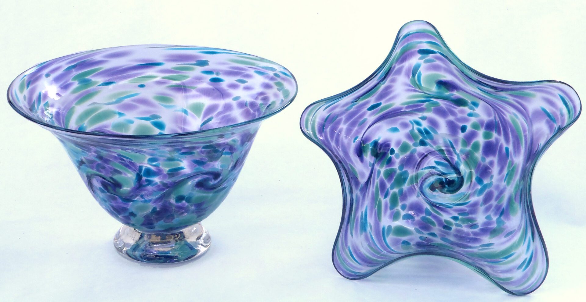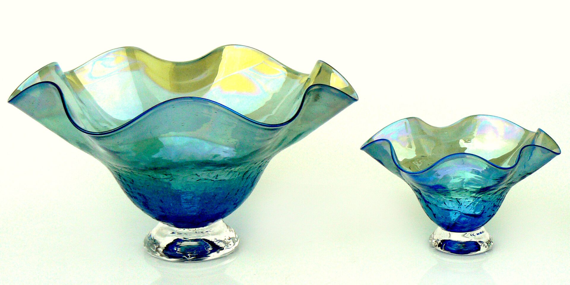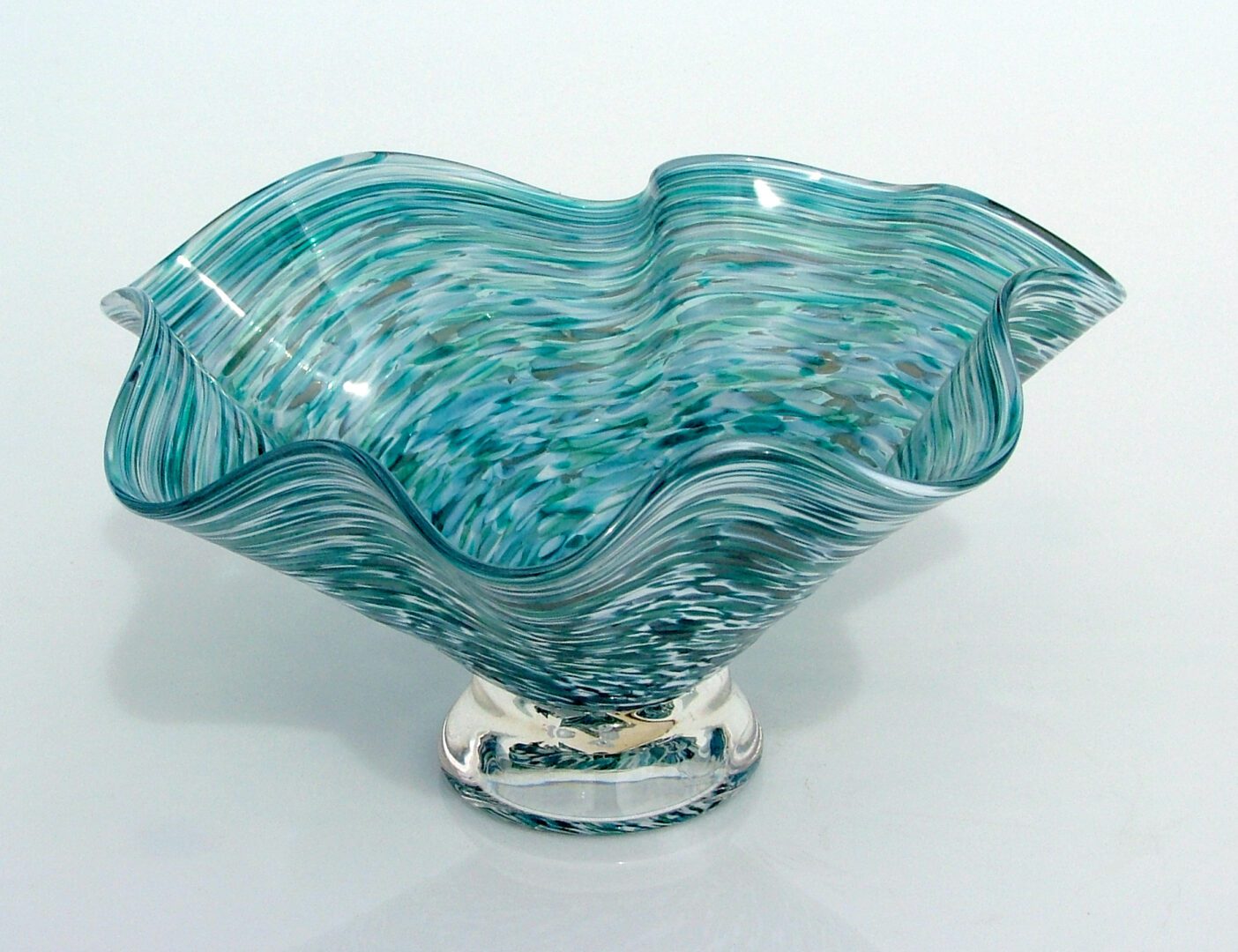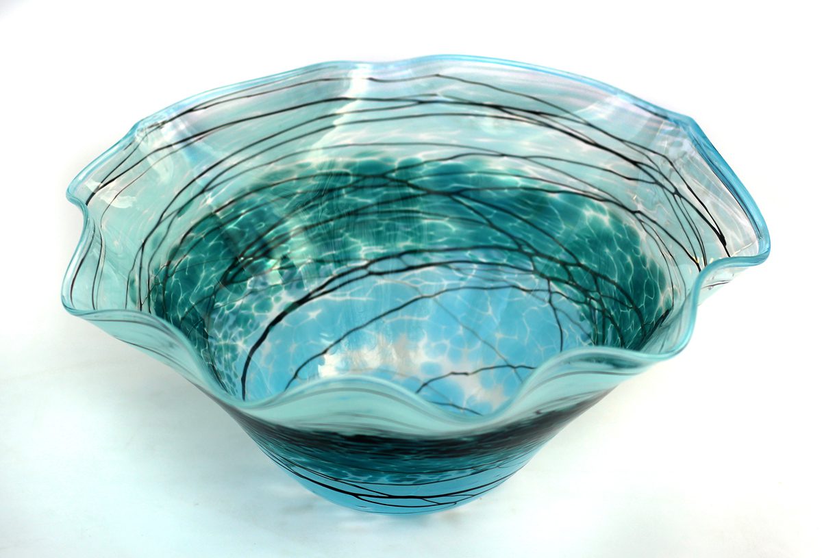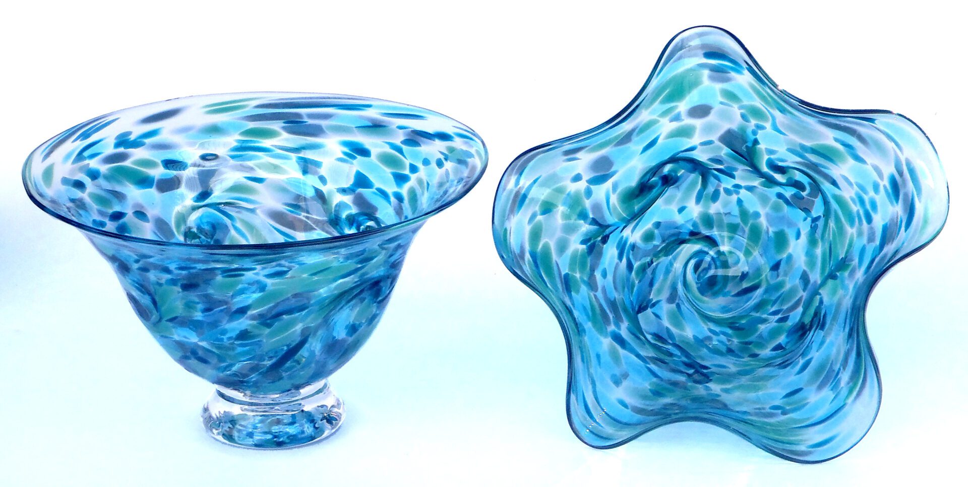 A blue glass bowl sitting on top of a table. A blue and white glass bowl sitting on top of a table. A blue glass bowl sitting on top of a table.