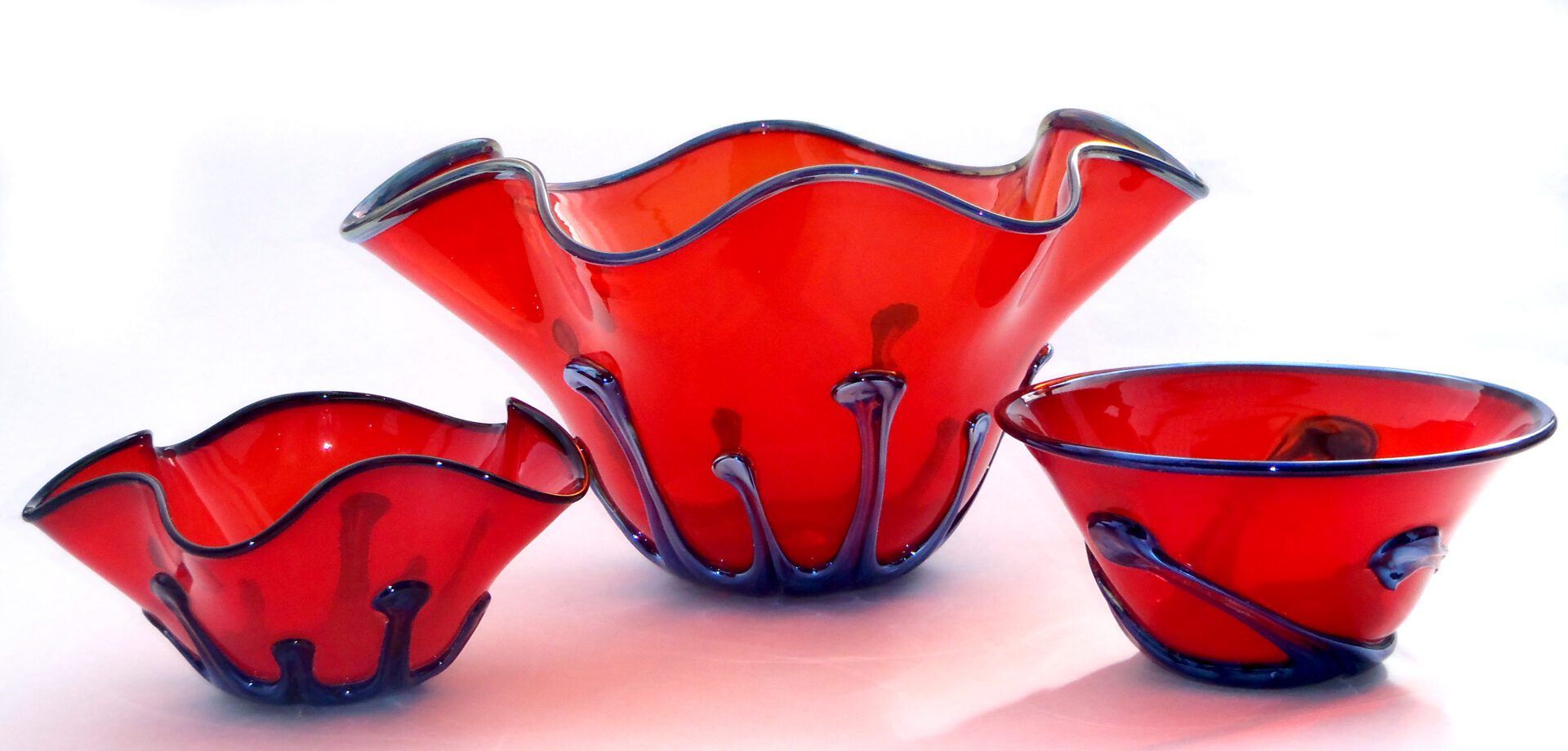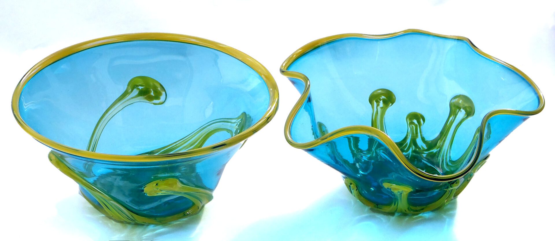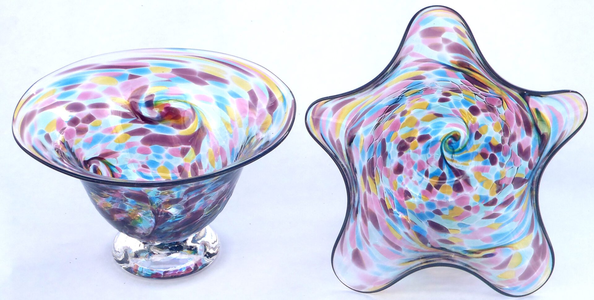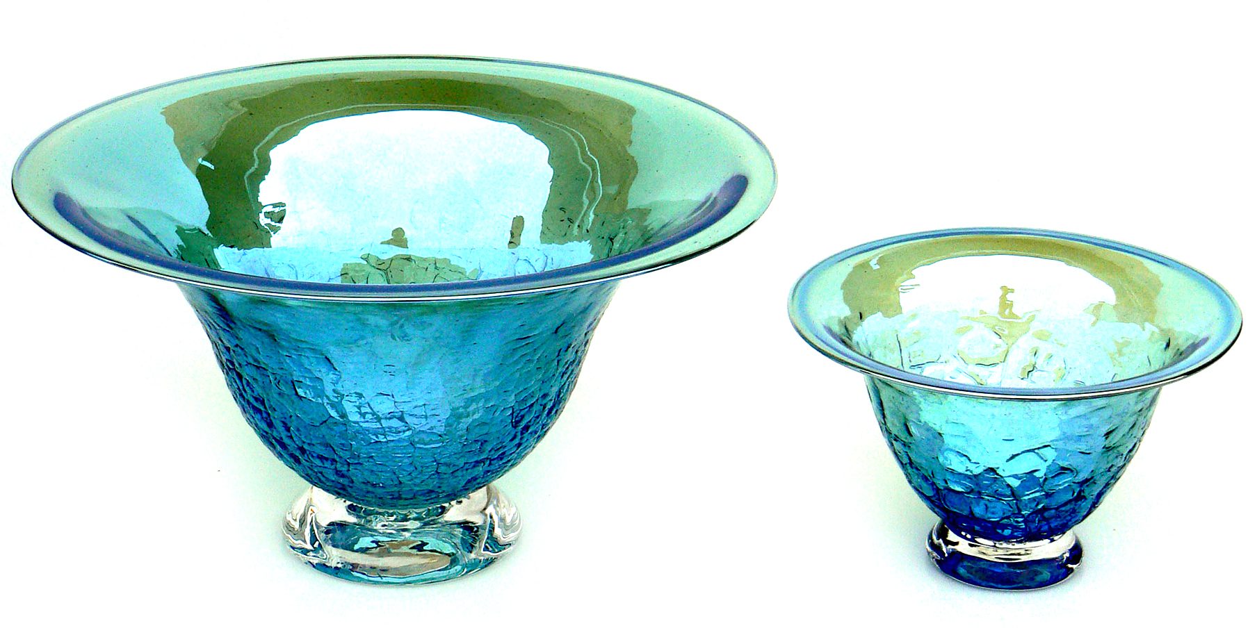 A blue glass bowl sitting on top of a table. A blue and white glass bowl sitting on top of a table. A blue glass bowl sitting on top of a table.