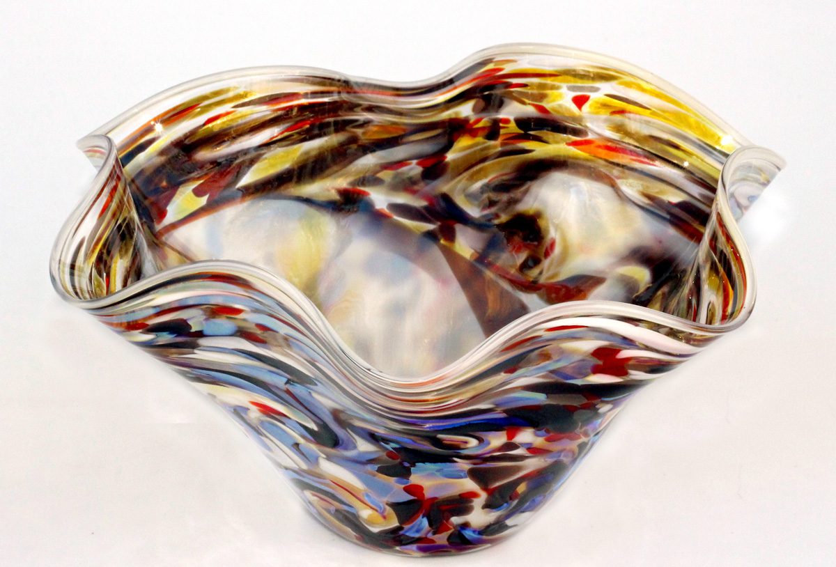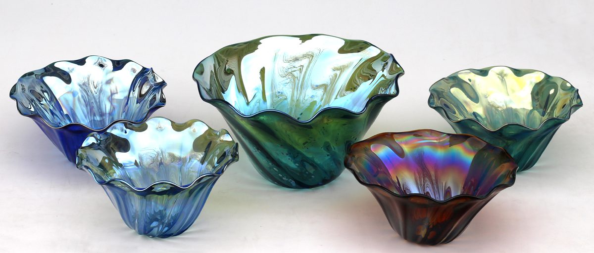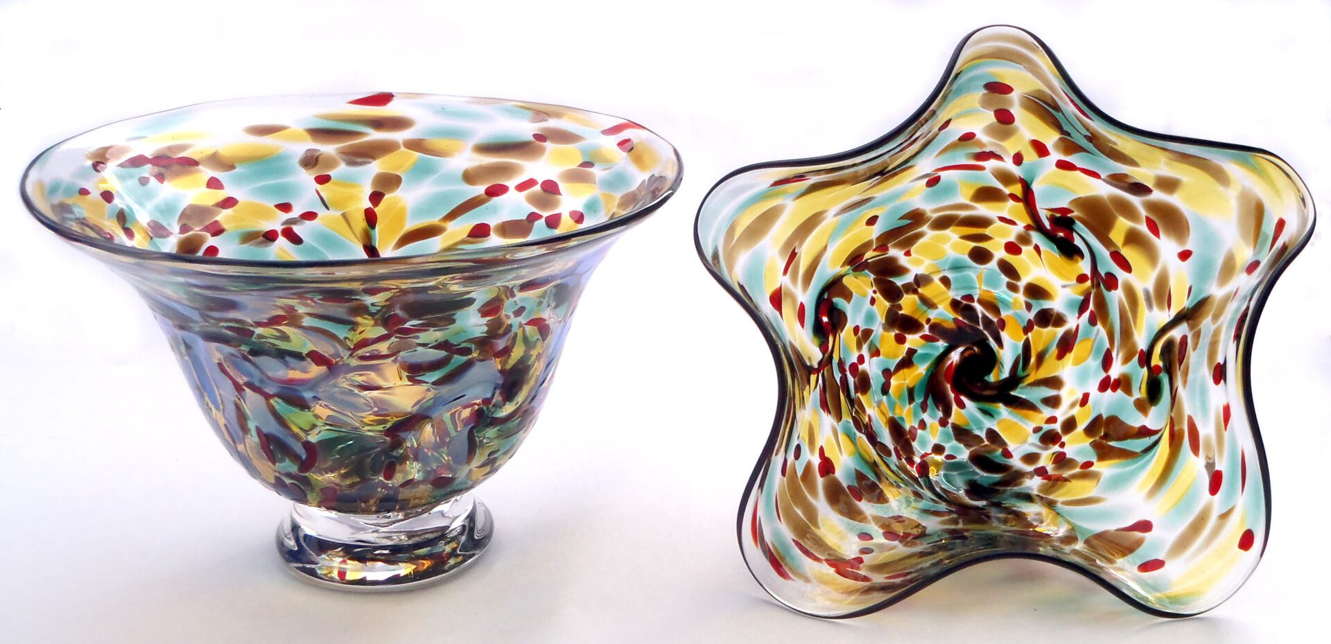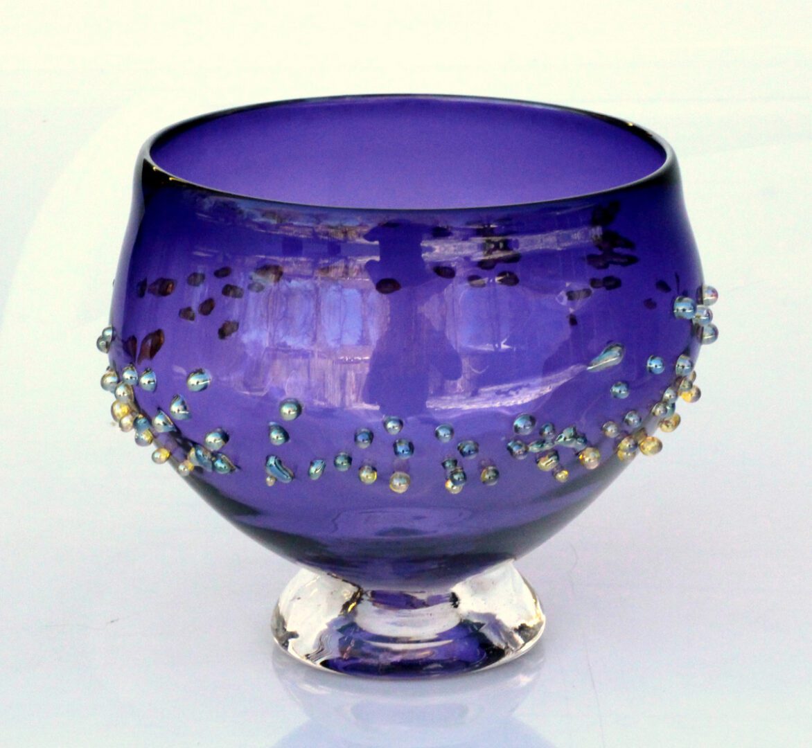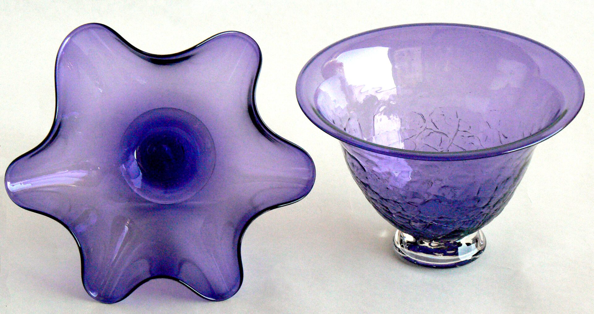 A blue glass bowl sitting on top of a table. A blue and white glass bowl sitting on top of a table. A blue glass bowl sitting on top of a table.