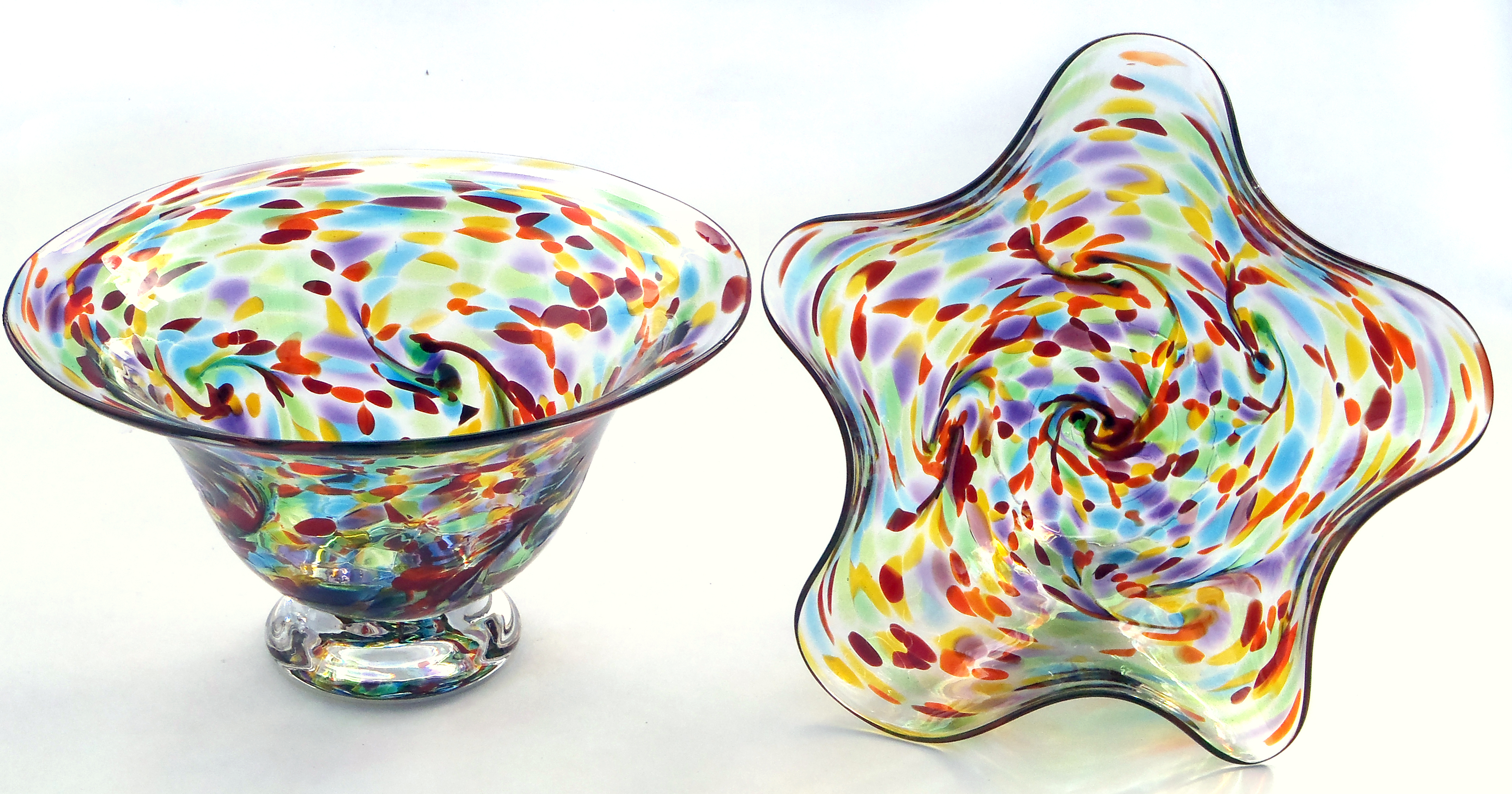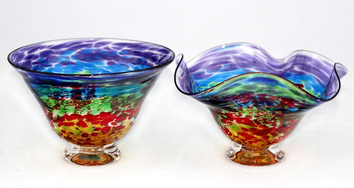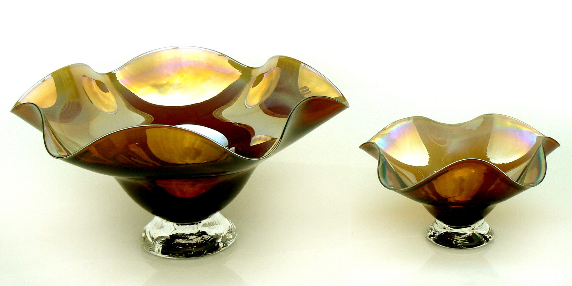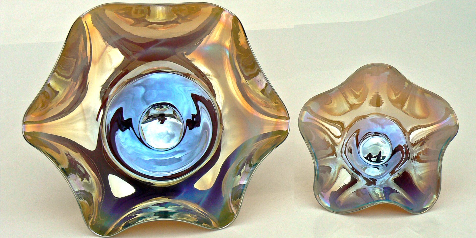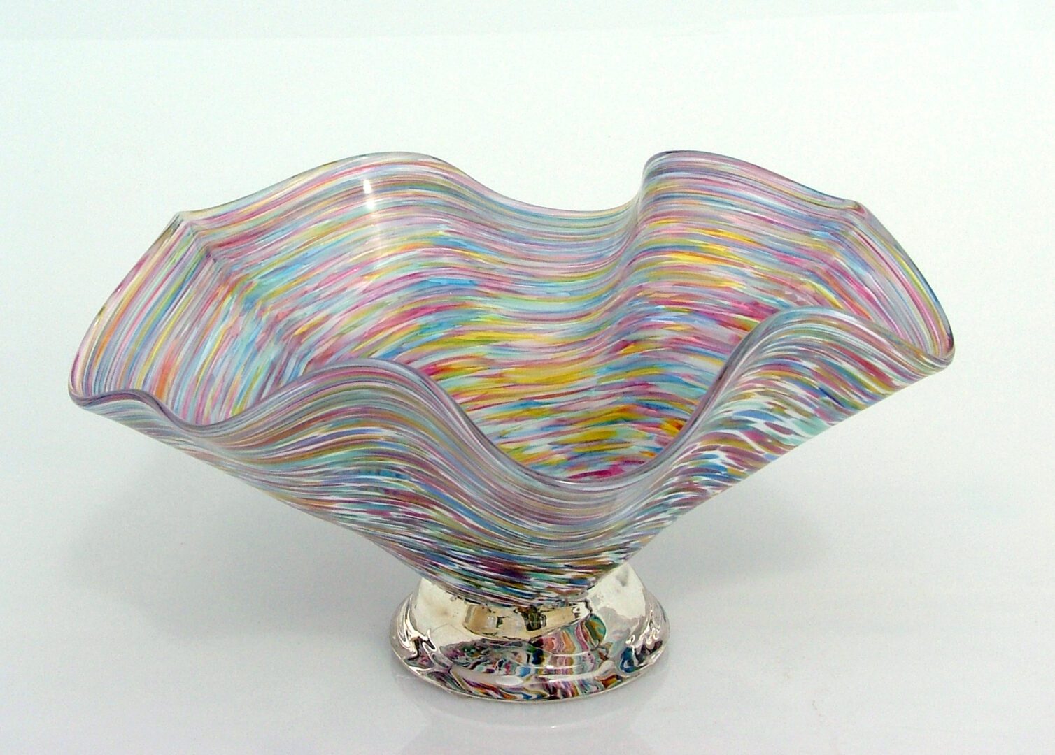 A blue glass bowl sitting on top of a table. A blue and white glass bowl sitting on top of a table. A blue glass bowl sitting on top of a table.
