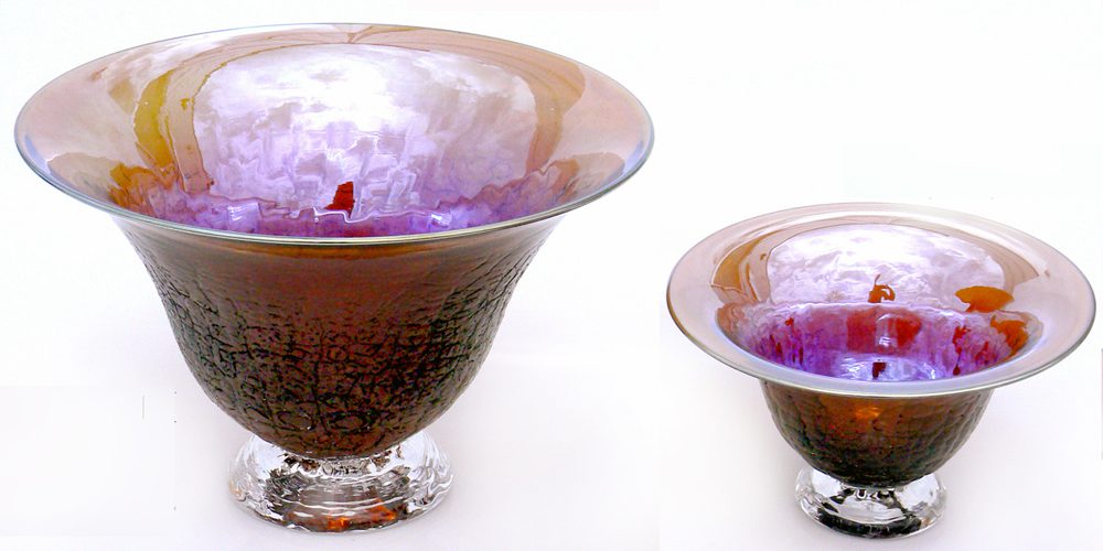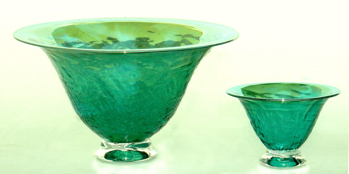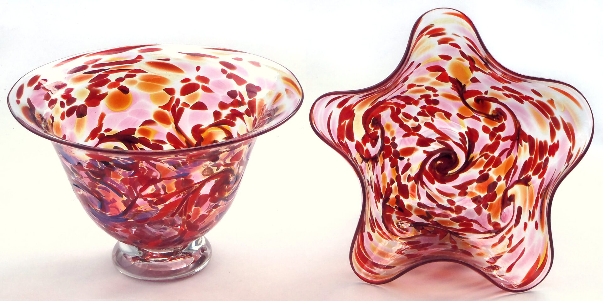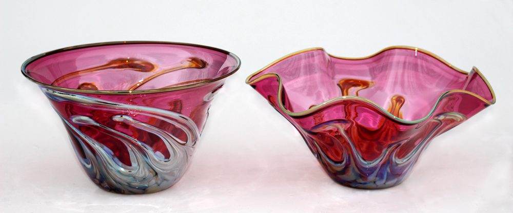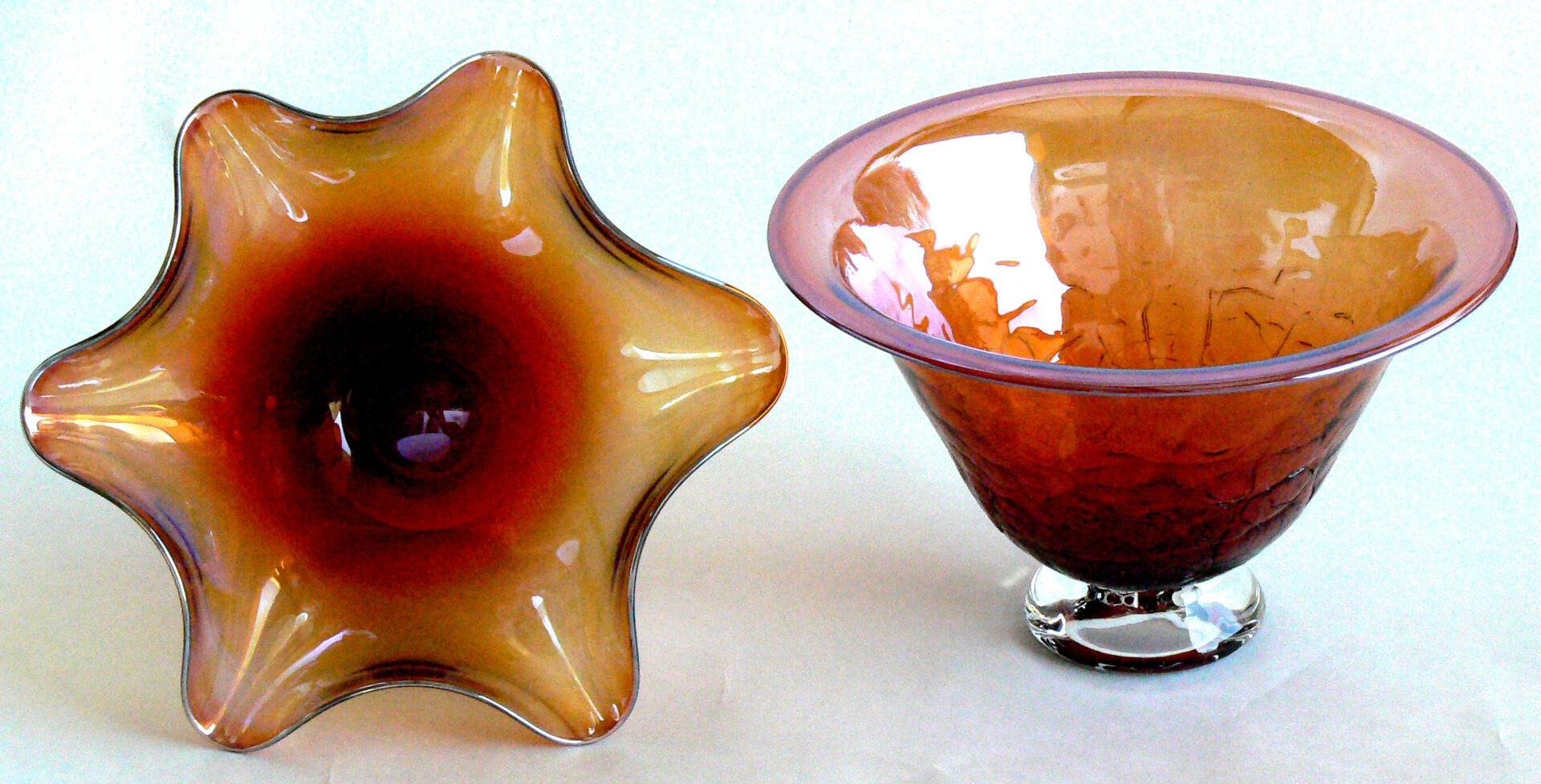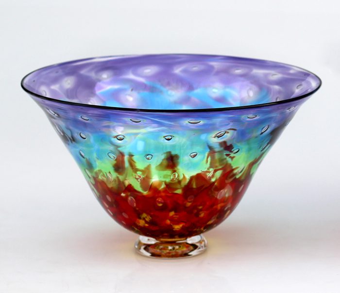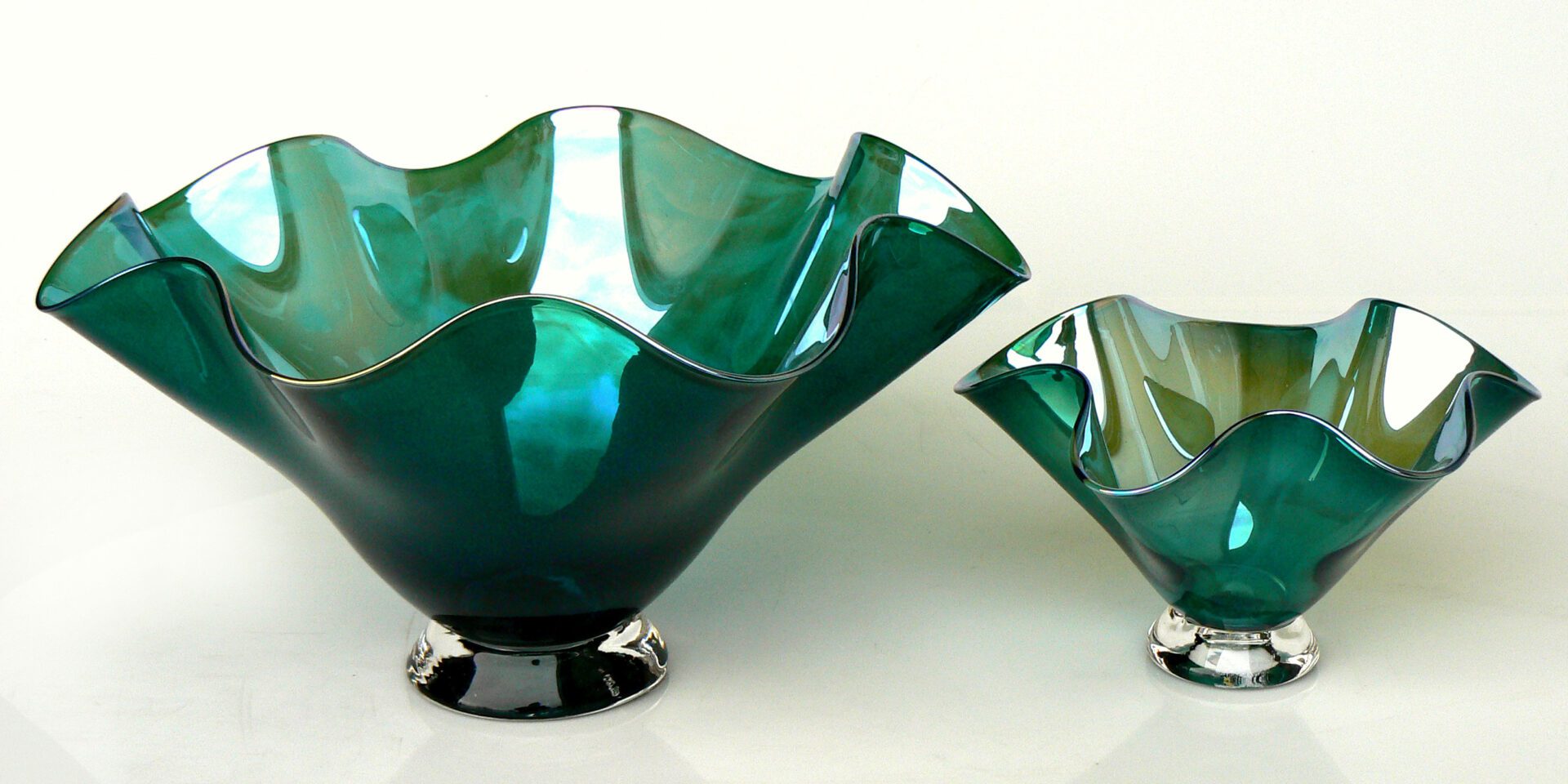 A blue glass bowl sitting on top of a table. A blue and white glass bowl sitting on top of a table. A blue glass bowl sitting on top of a table.